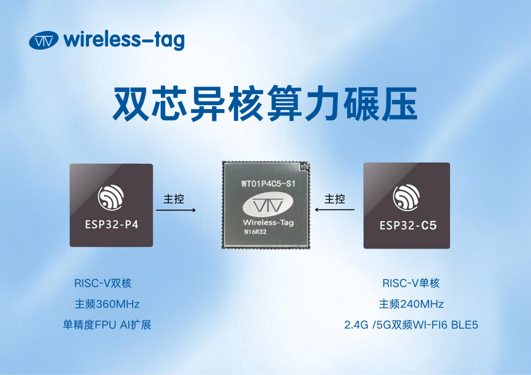 WT01P4C5-S1核心板采用ESP32-P4與ESP32-C5雙芯主控。兩顆芯片分工明確,協(xié)同運轉(zhuǎn)。