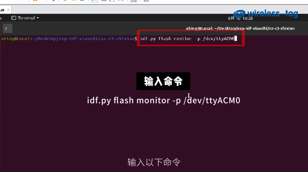 輸入 “idf.py flash monitor -p /dev/ttyACM0” 命令,開始燒錄小智固件。