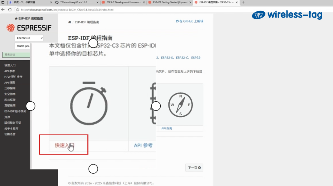 4. 點(diǎn)擊 “快速入門” 按鈕,在手動(dòng)安裝頁面中,根據(jù)系統(tǒng)選擇 “Linux and macOS”,按官方指南完成ESP-IDF環(huán)境配置