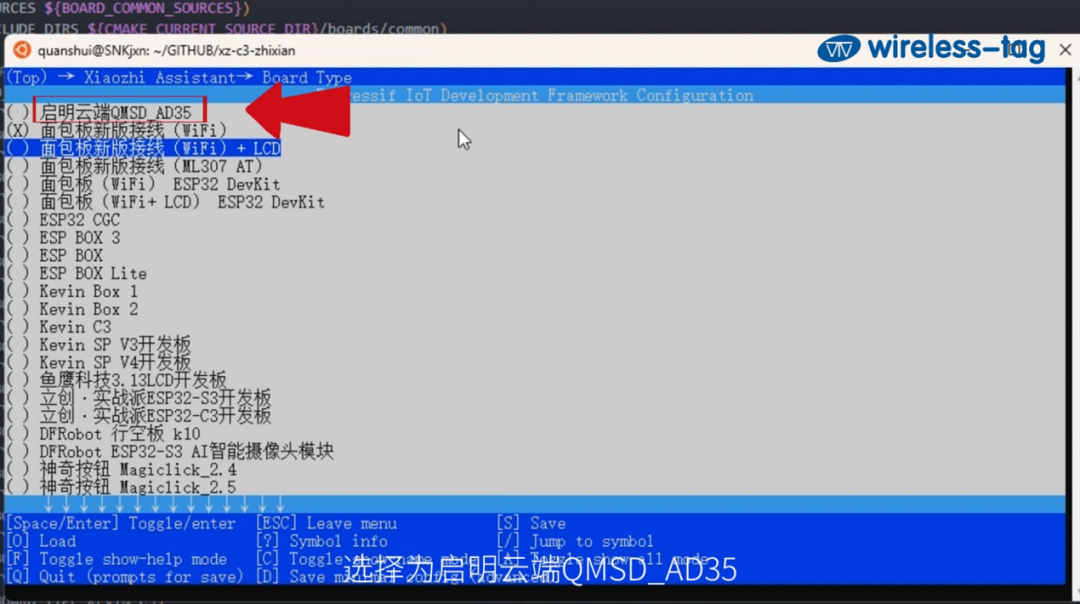 3.在配置界面中選擇 xiaozhi Assistant,將 Board Type 選擇為啟明云端 QMSD_AD35。