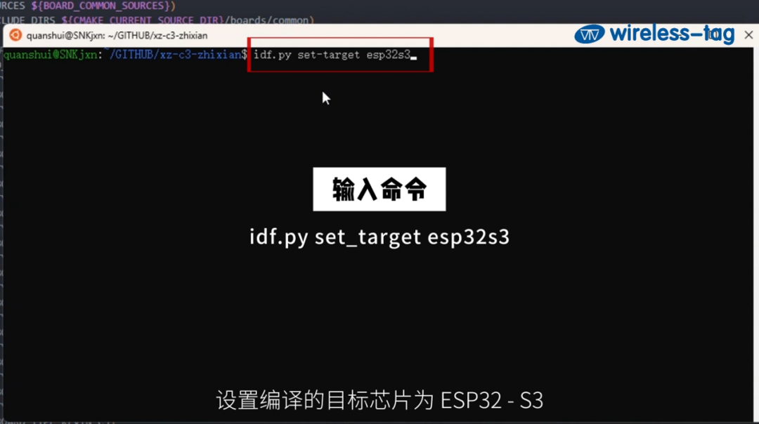 1.在命令行中輸入 idf.py set_target esp32s3,設置編譯的目標芯片為 ESP32 - S3。