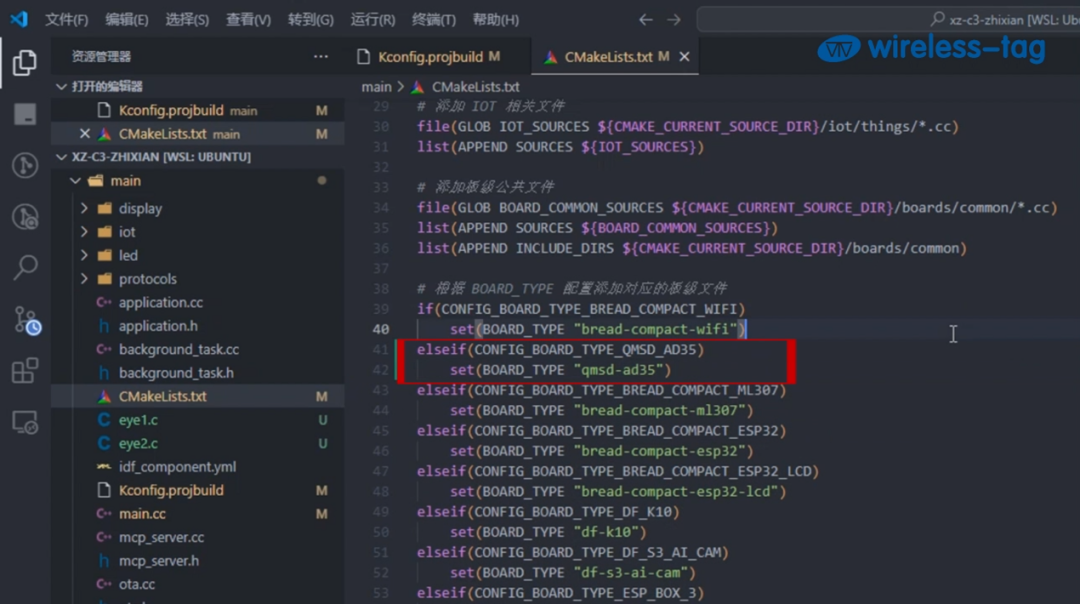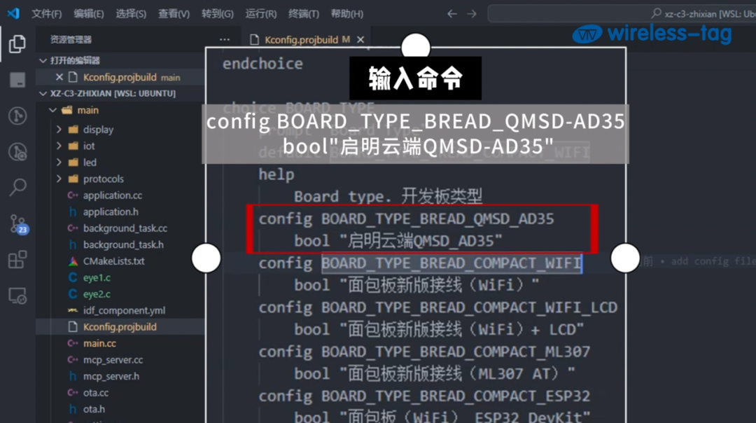 2.找到 main 目錄下的 kconfig.projbuild,在 board type. 開發(fā)板類型下添加 ad35 的板級型號:config BOARD_TYPE_BREAD_QMSD - AD35,bool“啟明云端 QMSD - AD35”。