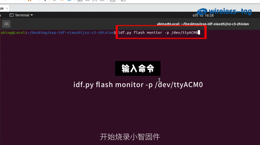 3.輸入 “idf.py flash monitor -p /dev/ttyACM0” 命令,開始燒錄小智固件。